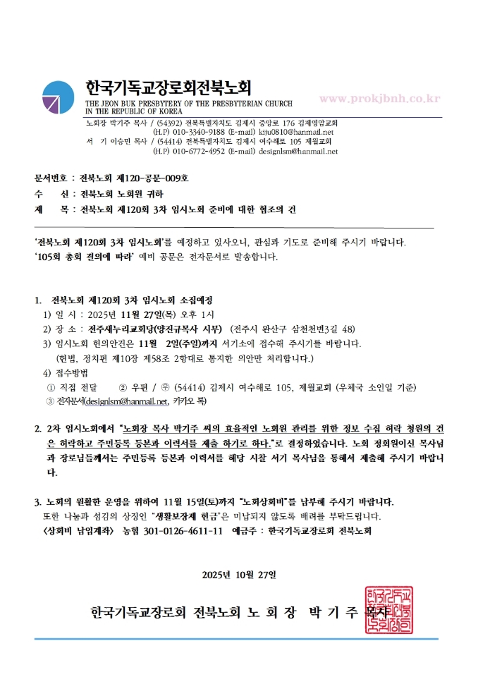 제120회 전북노회 3차 임시노회 준비에 대한 협조건